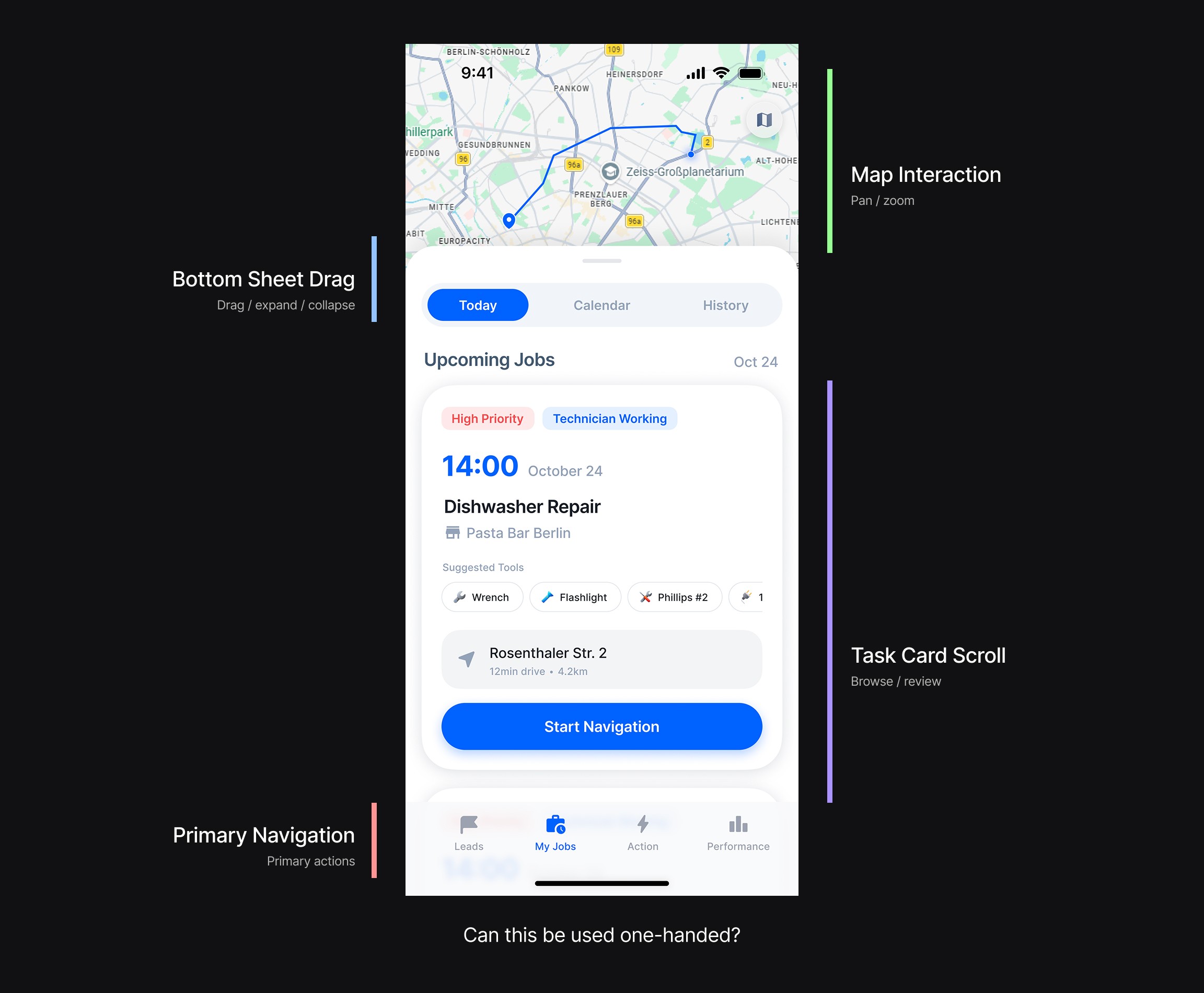 Horizontal scrolling separated task browsing from map interaction, reducing gesture conflicts.