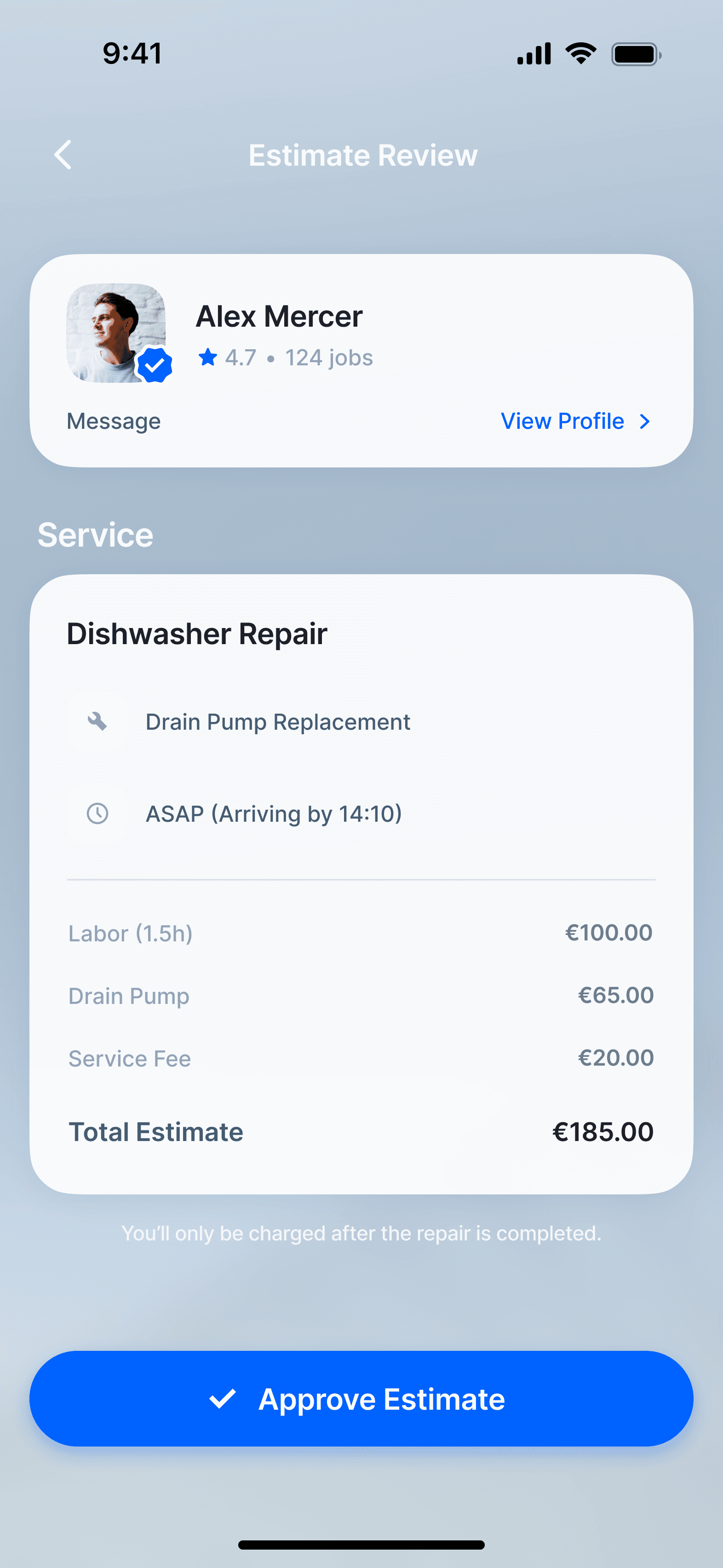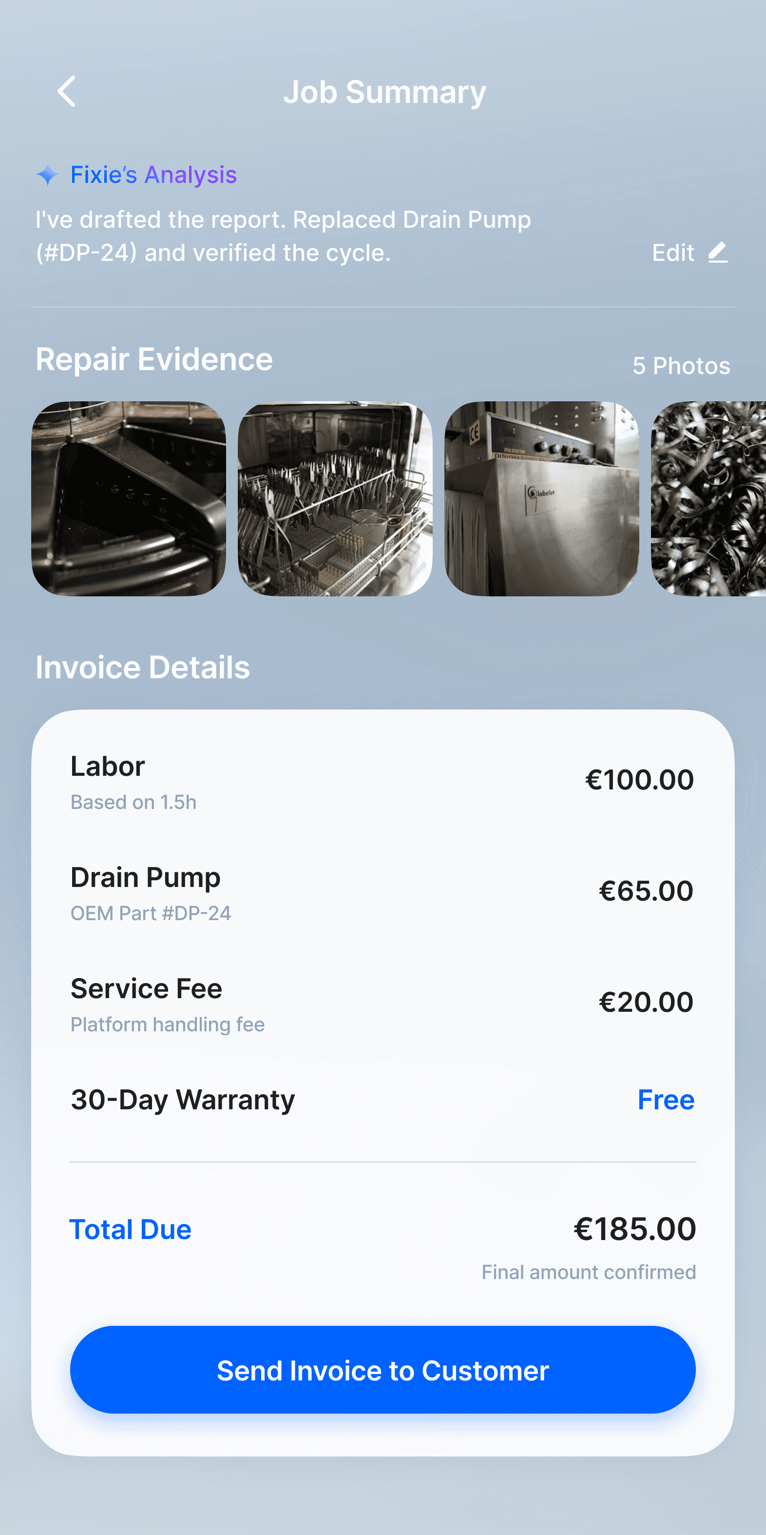 Before paying, customers can review the final cost, completed work, and technician proof in one clear flow.